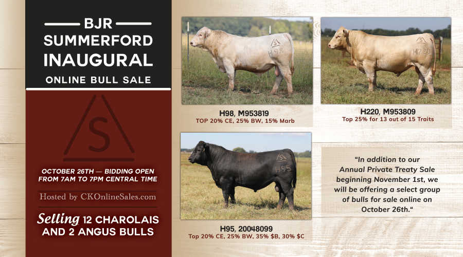 BJR Summerford Charolais is a North Alabama family operation located in Falkville, Alabama. In 1997, after being in the beef cattle seedstock business for 30 years we introduced the Charolais breed into our seedstock program. We have found that the Charolais, because of their great combination of health, growth and carcass traits are exactly what we were looking for.